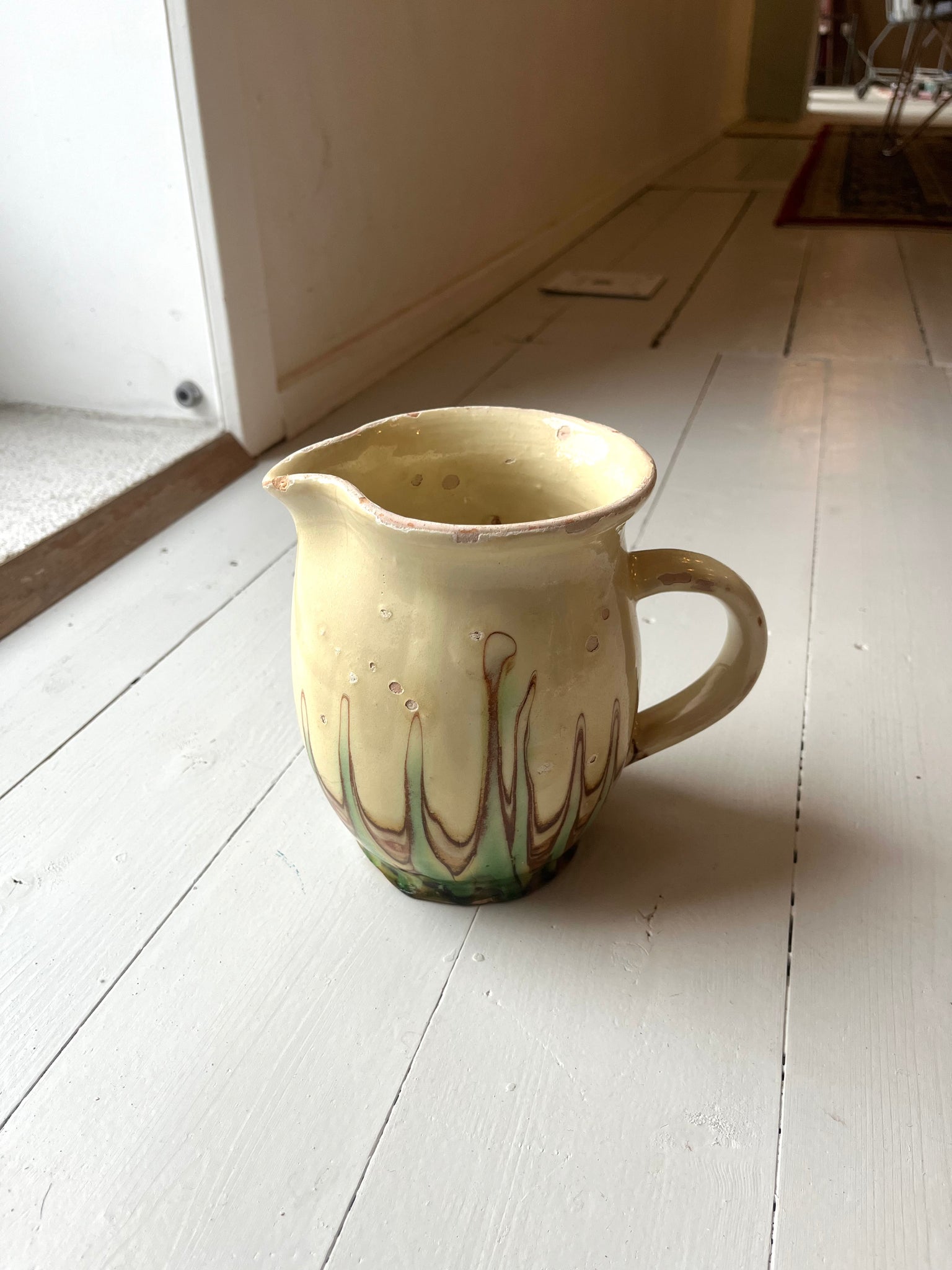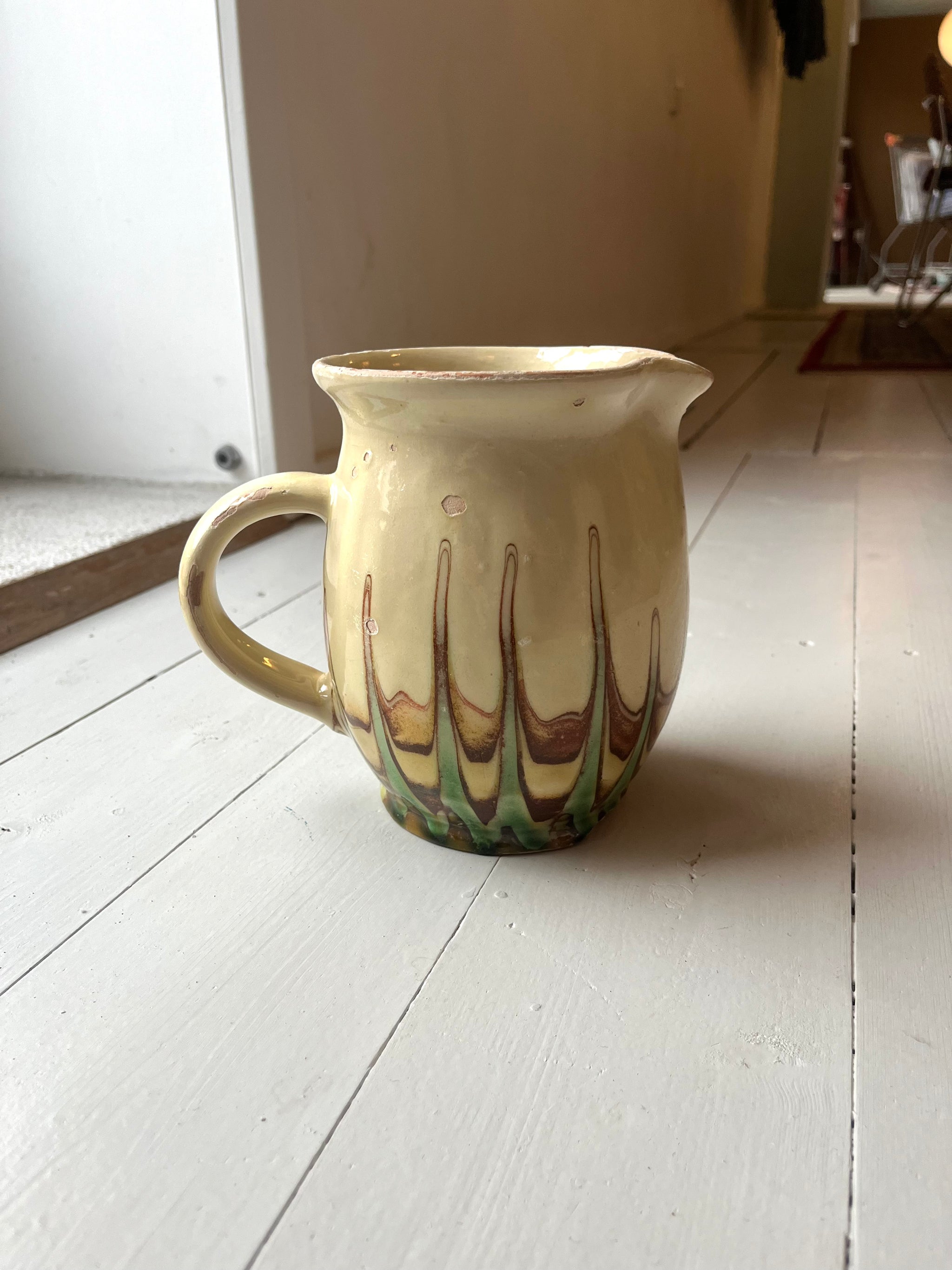 Fin keramikkande med flot grønt og brunt mønster.