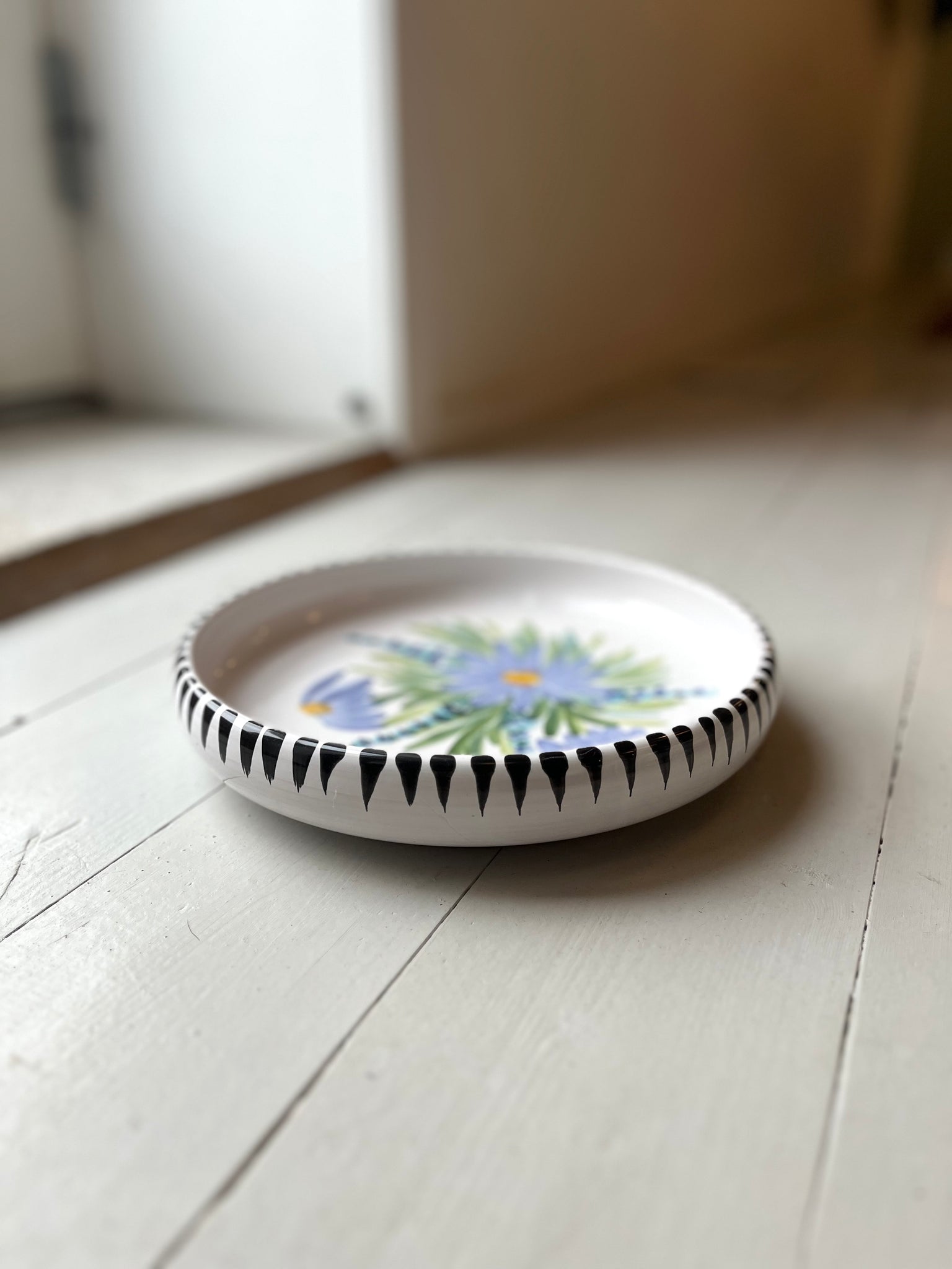 Sødt fad fra Juelsminde med flotte blå/lilla blomster.